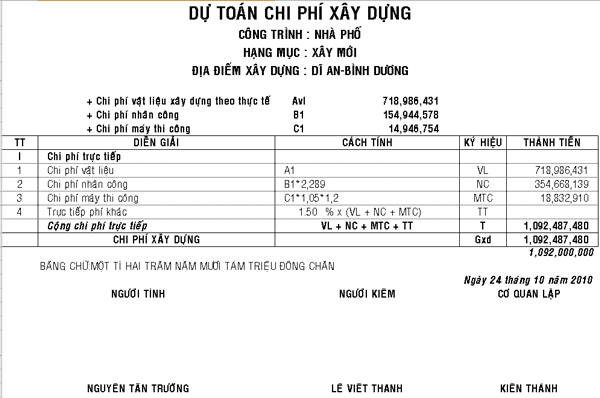 Trên đây là cách tính đơn giản dễ thực hiện cùng với mức báo giá cụ thể cho một ngôi nhà 2 tầng được xây dựng ở Bình Dương mặc dù chỉ mang tính chất tham khảo vì ai cũng biết rằng chi phí xây dựng nhà trên cả nước nói chung và ở tỉnh Bình Dương nói riêng chi phí xây dựng còn ảnh hưởng bởi rất nhiều yếu tố khác nhau như vị trí địa lí, địa hình của lô đất xây dựng. Nếu nằm ở thành phố và ở gần những khu công nghiệp dân cư đông đúc giá đất và giá xây dựng sẽ cao hơn so với những lô đất ở khu vực nông thôn.