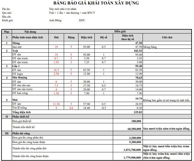 Đơn giá trọn gói trên chỉ giúp gia chủ ước lượng được kinh phí cần có để xây nhà, chứ chi phí chính xác phụ thuộc nhiều vào hồ sơ thiết kế và chủng loại vật tư hoàn thiện trong bảng báo giá dự toán chi tiết bên dưới.