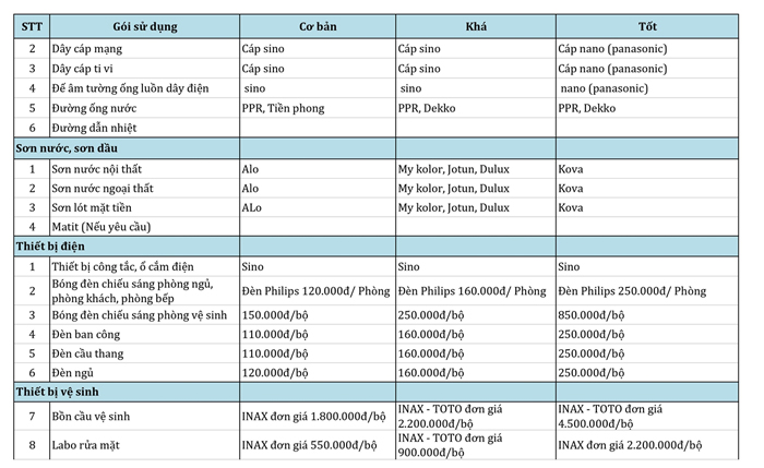 - Gói cao cấp (dành cho nhà phố 2 mặt tiền, nhà biệt thự phố): 5.800.000 đồng/m2 – 6.000.000 đồng/m2