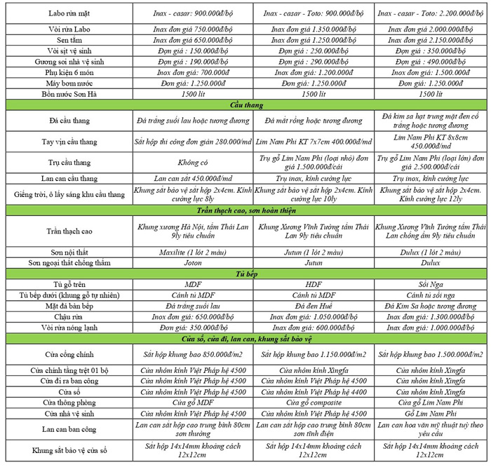 - Nguyên vật liệu loại tốt 1: 5.500.000 đồng/m2.