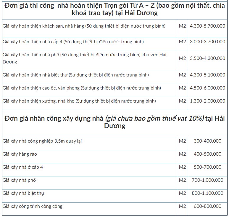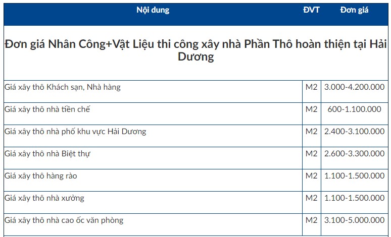 Báo giá chi phí xây nhà trọn gói phần thô tại Hải Dương mới nhất 2024 có đơn giá từ 2.500.000 đồng/m2 – 3.950.000 đồng/m2: