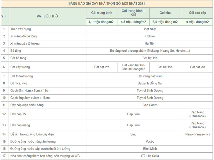 - Gói vật tư trung bình khá có chi phí khoảng 4.800.000VNĐ/m2 - 5.000.000 VNĐ/m2