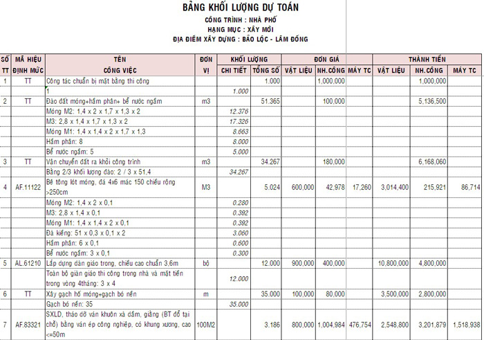 Bảng báo giá phần thô trọn gói tại Lâm Đồng mới nhất 2024