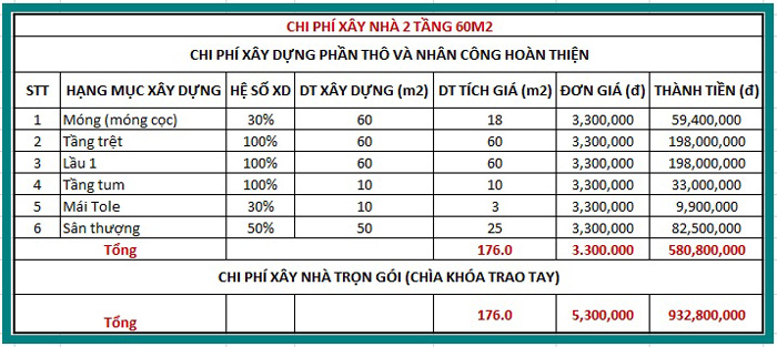 Nhân với đơn giá xây dựng trọn gói: 176m2 x 5.300.000 = 932.800.000đ. Như vậy, chi phí xây nhà 1 trệt 2 lầu 60m2 trọn gói tại Nam Định là 932.800.000đ tùy theo gói xây dựng trọn gói mà chủ đầu tư lựa chọn.