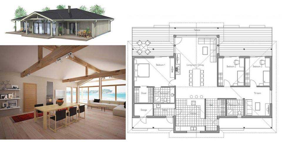 - Với nhà gỗ 3 gian- nhà gỗ ưa chuộng rộng rãi nhất hiện nay, thường trong thiết kế, nó được kẻ truyền gồm 6 cột. Đặc sắc nằm ở hoa văn chạm trổ, đó là sử dụng chạm trổ tứ quý như tùng, mai trúc cúc. Và dĩ nhiên bạn có thể sử dụng các loại hoa văn tùy theo ý thích của mình. Ngoài ra các gian nhà được nối với nhau một cách tinh tế hài hòa, và phía trước nhà được tạo nên một khoảng sân lớn được dùng làm vườn rau hay ao cá. Mẫu nhà này được bao bọc bởi màu xanh của cây, đón gió và nhận ánh sáng. Đây là một kiểu nhà đậm chất hoài cổ, thấm đẫm nét giản dị, phù hợp với những nét cổ xưa Việt Nam.
