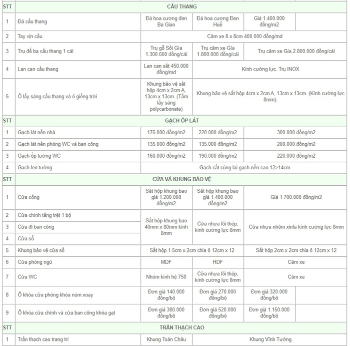Tùy thuộc vào loại nguyên vật liệu xây dựng, hoàn thiện mà chủ đầu tư lựa chọn, nhà thầu sẽ đưa ra những mức báo giá phù hợp. Dưới đây là báo giá thàm khảo gửi đến quý chủ đầu tư: