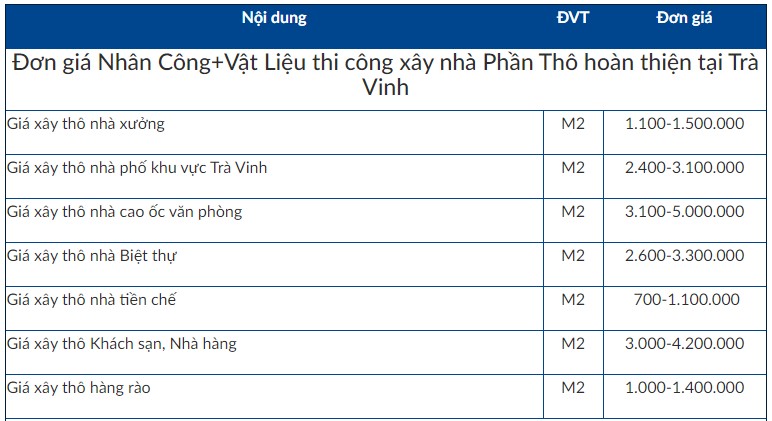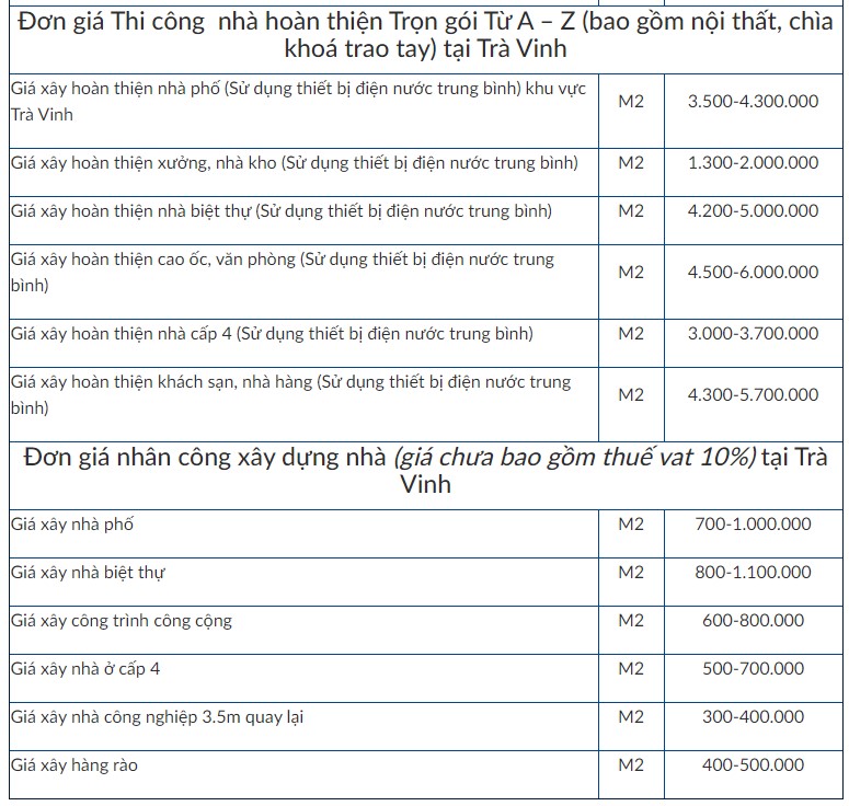 - Đơn giá xây dựng nhà trọn gói bao gồm chi cả chi phí nhân công hoàn thiện tại Trà Vinh: