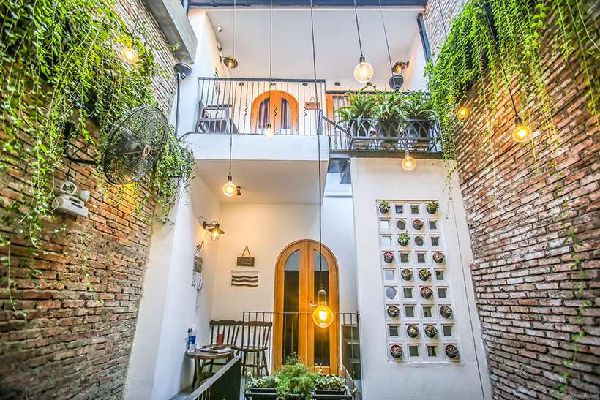 Trong một không gian nhỏ hẹp, kiến trúc sư sử dụng phong cách kiến trúc hiện đại để có thể tối đa nhất diện tích ở mình. Màu trắng chính là tone màu chủ đạo của cả công trình, điểm nhấn trên nền trắng ấy là khung cửa làm bằng gỗ, tiểu cảnh cây xanh, bức tường với chậu hoa nhỏ, và những chiếc đèn tròn màu vàng ấn tượng. Điều làm vị khách hài lòng ở đây chính là bức tường gạch để nguyên, không trát xi và được trông hàng cây xanh rủ xuống tạo nên không gian khá tình. Tại không gian này những bức hình đẹp nhất sẽ được checkin với nhiều sự yêu thích.
