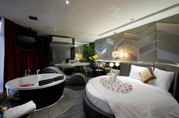 Một không gian phòng khách sạn tại Quận 1 mang đến sự hiện đại vô cùng sẽ là gợi ý tham khảo tiếp theo dành cho gia chủ tương lai. Trong không gian này, kiến trúc sư lựa chọn màu tối, nhưng mang màu sắc lãng mạn rất thích hợp cho các cặp đôi để tận hưởng kỳ nghỉ trăng mật. Phòng khách sạn được bố trí với chiếc giường ngủ tròn, 1 bồn tắm được đặt ngay trong cùng không gian với giường ngủ, 1 bộ bàn ghế trang điểm, đủ để vị khách cảm thấy tiện nghi ngay trong chính ngôi nhà của mình.