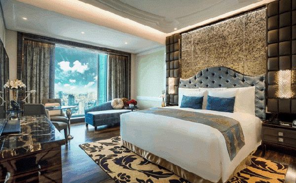 Không gian phòng khách sạn tại quận 1 theo phong cách kiến trúc tân cổ điển. Phần đầu giường được ốp đá hoa cương, bọc da đầy sang trọng. Điểm nhấn chiếc thảm, hay nội thất ốp đá, cùng với những chiếc đèn pha lê rức sáng nhưng tất cả tổng hoà với nhau tạo nên không gian ngủ cực yên tĩnh.