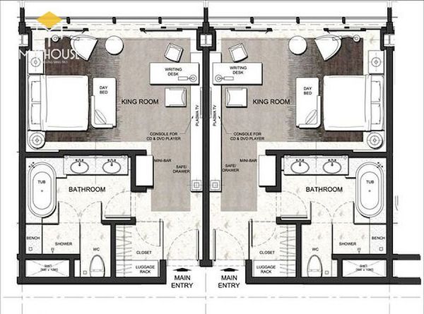 Một trong những gợi ý bố trí không gian phòng trong xây khách sạn tại quận 1 như sau: bao gồm 2 phòng với không gian ngủ và nhà vệ sinh. Cách bố trí này áp dụng cho không gian có diện tích hạn chế và gia chủ có mô hình kinh doanh khách sạn nhỏ.