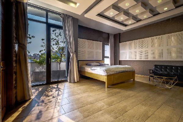 Một gợi ý trang trí phòng khách sạn tại Quận 2 cho gia chủ tham khảo sử dụng tone màu trầm mang đến cảm giác ấm cúng cho khách thuê. Không gian tối giản hết sức có thể các thiết bị điện tử để người thuê phòng có được một không gian yên tĩnh nhất, dễ dàng đi vào giấc ngủ, và sáng mai thức dậy có được nguồn năng lượng tươi mới. Không gian sử dụng cửa kính cỡ lớn khung thép vững chãi lấy toàn bộ ánh sáng vào bên trong không gian phòng. Ban công với diện tích rộng sử dụng tiểu cảnh cây xanh mang đến cảm nhận tươi mát, không bị nắng gắt chói.