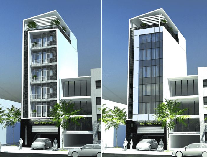 Với những khách sạn 7 tầng thì quy mô không quá lớn, nó chỉ có 1 mặt tiền vừa phải cho nên rất khó để phô bày được toàn bộ vẻ đồ sộ của nó. Chính vì vậy, các kiến trúc sư với sự linh hoạt trong con mắt thẩm mĩ đã áp dụng thiết kế đối xứng, thiết kế cân bằng với các họa tiết trang trí để làm nổi bật mặt tiền cho khách sạn 7 tầng.