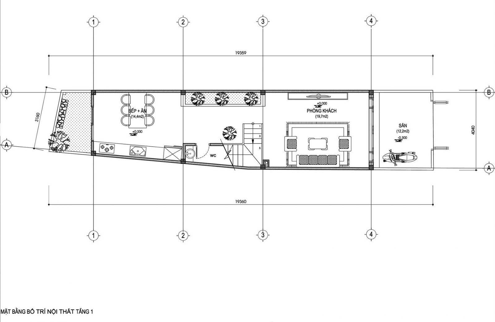 Với diện tích ô đất chéo, phương án thiết kế kiến trúc nhà 3 tầng 30m2 đã khó, phương án tối ưu công năng còn khó khăn hơn. Với hiện trạng ô đất như vậy, án mặt bằng công năng cho công trình như sau: