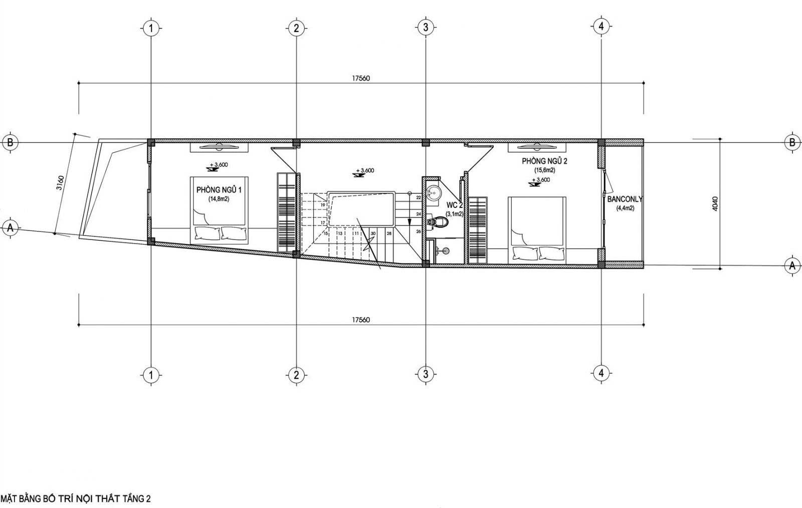 Tầng 2 thiết kế 2 phòng ngủ, đối diện qua cầu thang thông tầng đặt sát tường ở trung tâm của không gian. Phòng ngủ master thiết kế hướng ban công chính, tiếp giáp ngay nhà vệ sinh chung của tầng 2, phía đối diện là phòng ngủ của con.