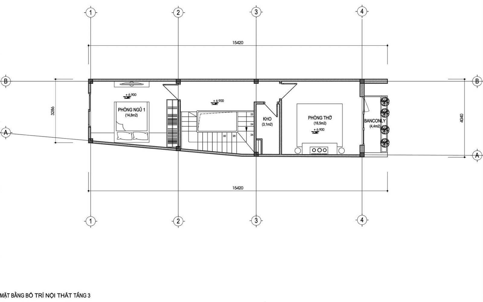 Tầng 3 thiết kế 1 phòng ngủ và 1 phòng thờ, phòng thờ được ưu tiên thiết kế hướng chính hướng ra ban công, tiếp giáp phòng thờ là một kho nhỏ, tận đụng để chứa đồ. Bên kia cầu thang là không gian phòng ngủ của con.