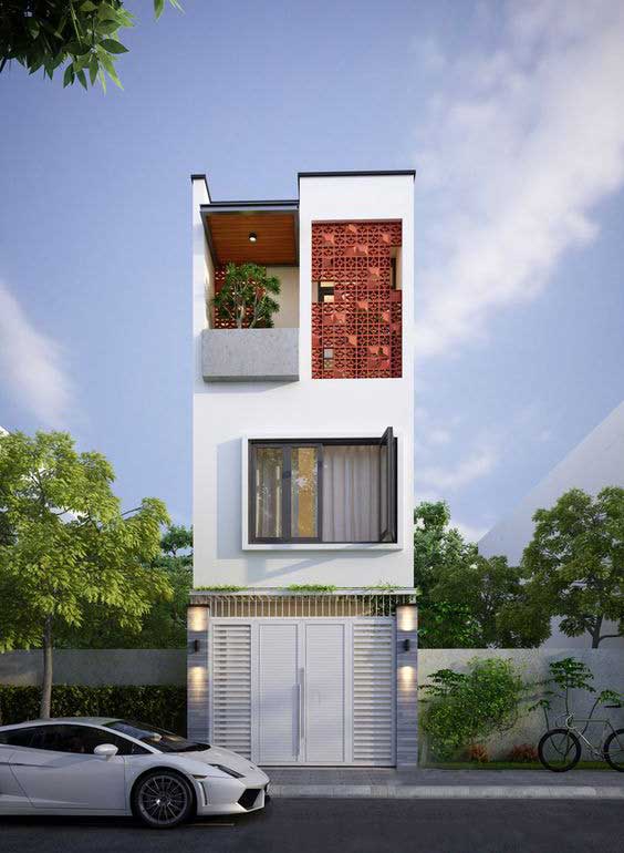 Mặt tiền thiết kế nhà 3 tầng diện tích 40m2 đơn giản tận dụng diện tích tối đa nhằm tăng không gian sử dụng, cửa sổ bằng kính cùng gạch bông gió đưa ánh sáng vào trong mang đến sự thông thoáng cho toàn bộ căn phòng. Màu trắng nhẹ nhàng tinh khôi, thêm chút đỏ làm điểm nhấn cho toàn bộ công trở nên sinh động hơn.