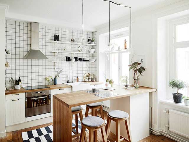 Phòng bếp thoáng đãng nhờ những không gian xanh xung quanh. Trong căn bếp nhỏ này, thay vì sử dụng hoàn toàn màu trắng sáng, thì kiến trúc sư đã tạo một điểm nhấn khác biệt. Đó là bức tường trong khu bếp được phủ một lớp áo kẻ caro nổi bật. Từ đó, căn bếp trở nên thật phong cách với biến tấu màu sắc này.