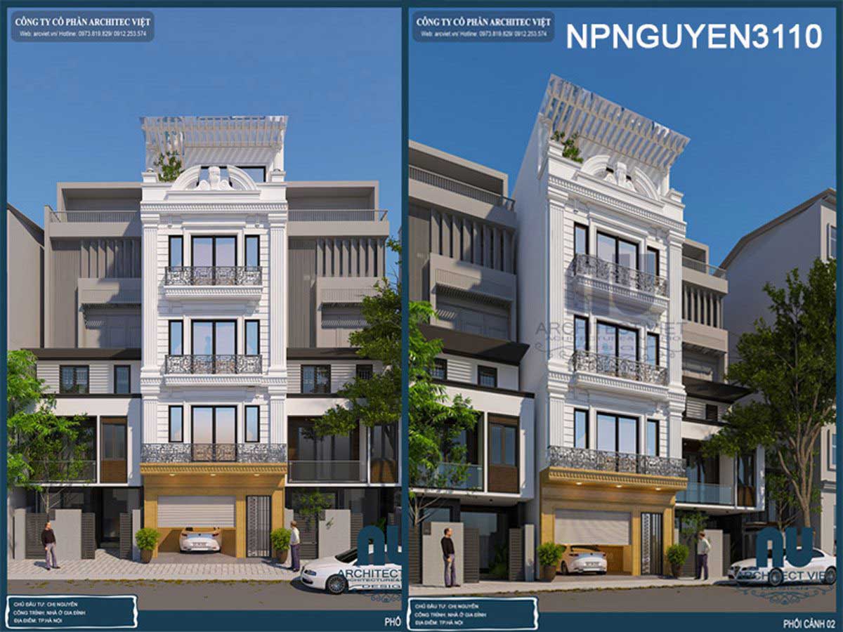 Kiểu kiến trúc thứ hai có thể áp dụng cho những căn nhà 5 tầng 50m2 này chính là kiến trúc theo phong cách tân cổ điển. Với thiết kế này gia chủ mang đến nét đẹp châu Âu cổ kính vào ngôi nhà của mình. Sử dụng gam màu sáng, trắng làm chủ đạo để đảm bảo được tính tinh tế cùng vẻ đẹp sang trọng cho ngôi nhà. Khác với phong cách hiện đại ở phía trên, ngôi nhà 5 tầng 50m2 này sẽ khiến người ta chú ý bởi chính những hoa văn họa tiết được sử dụng ở khu vực tầng, phần mái của ngôi nhà. Ban công sử dụng sắt mạ đồng, sơn đên, uốn trang trí đúng chuẩn châu Âu để nhấn mạnh giữa sắc trắng tinh tế của ngôi nhà.