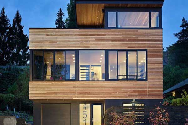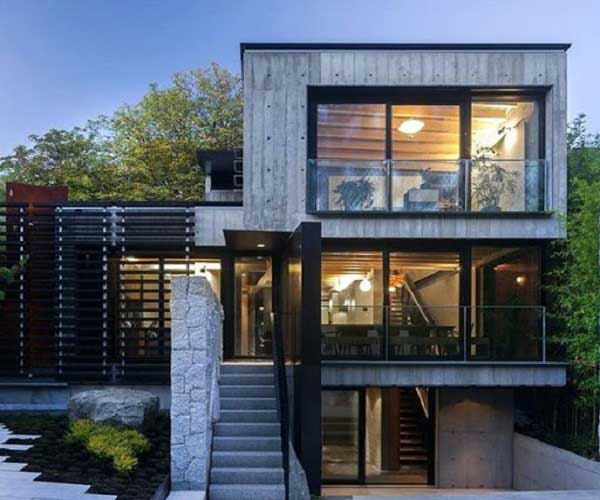 Mẫu thiết kế đầu tiên chúng ta cùng chiêm ngưỡng với vẻ đẹp chắn chắn mà khung thép mang lại. Có sự kết hợp của những song gỗ mịn màng bao quanh căn nhà tạo điểm nhấn. Ở tầng trệt của ngôi nhà được thiết kế gara ô tô. Phía tầng 2 và tầng 3 bên cạnh khung thép là những tấm kính trong suốt. Giúp cho ngôi nhà luôn trở lên thông thoáng.