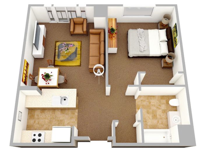 So với các thiết kế hiện đại với nhiều không gian khác nhau, các nhà đầu tư có thể tham khảo ý tưởng ngay phía dưới đây với ý tưởng xây dựng chung cư mini cho thuê. Cấu trúc không quá phức tạp nhưng vẫn thể hiện công năng với 1 phòng khách, 1 phòng ngủ, 1 nhà bếp và 1 nhà vệ sinh. Lối bài trí vuôn vắn với các căn phòng chức năng được phân bổ xung quanh ngôi nhà. Đây cũng là một gợi ý trang trí cho các gia đình đang có dự định cải tạo không gian sống cho gia đình.