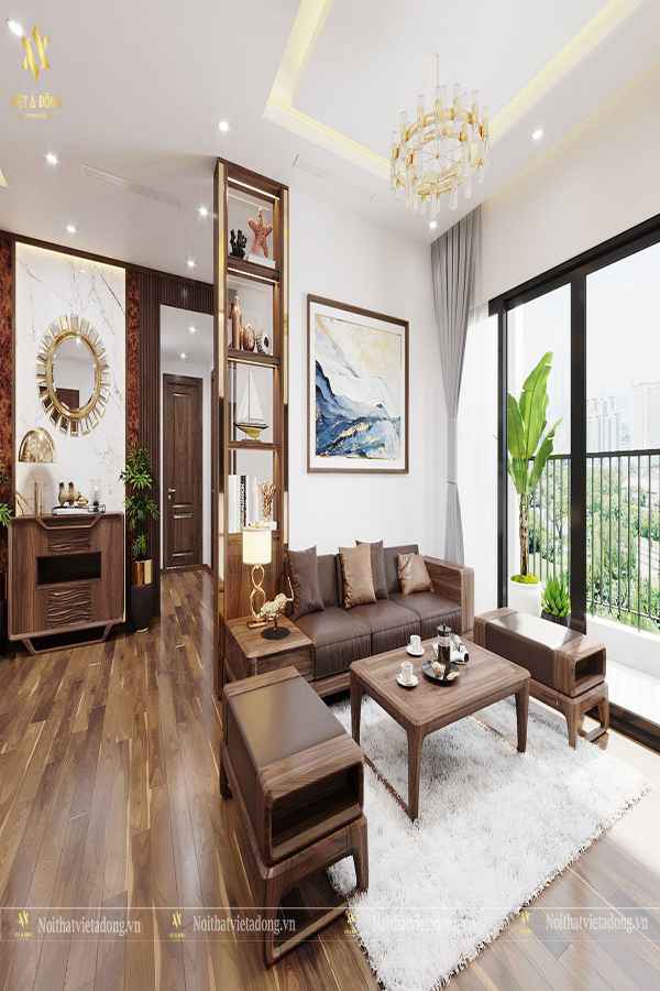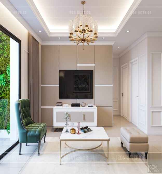 Vẻ đẹp của trang trí nội thất phòng khách càng nhấn mạnh hơn khi nhà thiết kế kết hợp bộ đèn chùm trên trần nhà tạo ánh sáng mờ ảo không gian ngôi nhà ban bên cho bầu không khí gia đình thêm quyến rũ và vui vẻ. Phía đối diện phòng khách chính là bước đột phá của bộ thiết kế này bởi cấu tạo chiếc kính trắng cho gia chủ có thể phóng thẳng tầm nhìn ra phía vườn hoa, cây cảnh cũng như những chú chim cảnh mà chủ nhân chăm sóc hàng ngày. Kính trắng được thiết kế tại đây tạo không gian phòng khách thêm rộng mở và thoáng đãng hơn.