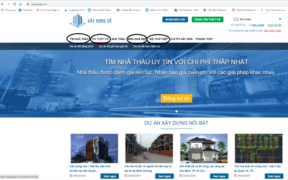 Bước 2: Đăng nhập tên đăng nhập vào trang website và bắt đầu sử dụng tìm kiếm: Tìm nhà thầu, thiết kế, mẫu nhà đẹp, ….