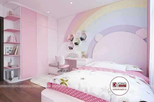 Ngược với thiết kế không gian nội thất của bé trai là bé gái với gam màu hồng tươi sáng yêu đời của con gái mộng mơ. Các nhà thiết kế dày dặn kinh nghiệm và rất am hiểu tính cách của các thành viên nhí trong gia đình nên các thiết kế này rất thích hợp với bé. Nhà thiết kế của công ty còn thiết kế tủ gắn tường giành riêng cho bé trang trí các búp bê xinh yêu thích của mình. Đây quả là điều tuyệt với nhất đúng không các bạn?