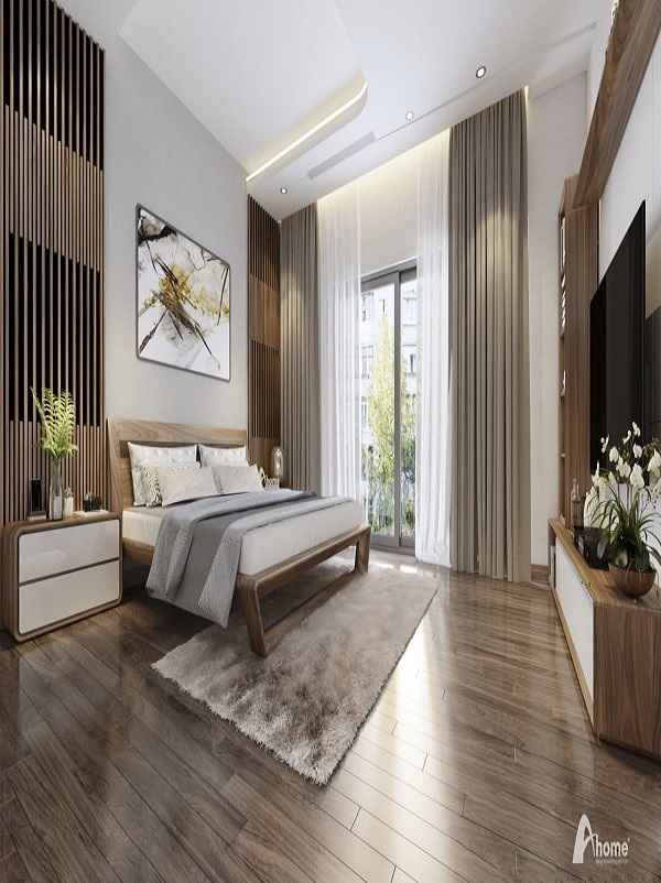 Hình ảnh trên là mẫu thiết kế của công ty thiết kế nội thất uy tín tai Cà Mau, với hình ảnh trong tranh chúng ta có thể thấy các nội thất được trang trí thiết kế rất khoa học tạo nên vẻ đẹp sáng ngời cho không gian ngôi nhà. Nhà thiết kế thiết kế chiếc giường ngủ to rộng được gia công từ chất liệu gỗ tự nhiên 100%. Tạo nên vẻ đẹp ấm áp cho cả căn phòng, kết hợp bộ chăn ga màu xám càng tôn nên vẻ đẹp của giường và vẻ đẹp của căn phòng ngủ. Đồ nội thất trong phòng ngủ của khách hàng này được thiết kế hoàn toàn từ chất liệu gỗ, Chiếc tủ quần áo to với 3 buồng được làm từ gỗ xoan với các dường vân nổi rất bắt mắt và sang trọng khi kết hợp màu sơn gỗ cho tủ. Phía bên kia chủ nhân căn phòng thiết kế chiếc tủ nhỏ để các đồ trang trí như hình con vật lọ hoa và cả các bình rượu quý của gia chủ… Căn phòng nhủ của khách hàng được kết hợp với kính trắng nhìn ra phía bên ngoài, đón ánh sáng vào phòng làm cho căn phòng thêm rộng mở nhiều. Đây quả là một không gian phòng ngủ thật lãng mạn và hữu tình.