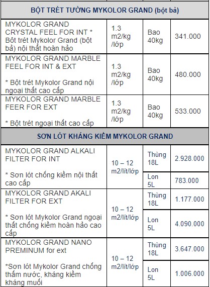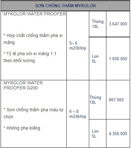 3. Bảng báo giá thương hiệu sơn Mykolor