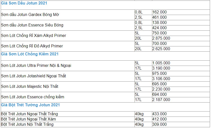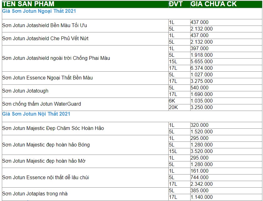 Xem qua bảng báo giá thườn hiệu sơn Jotun: