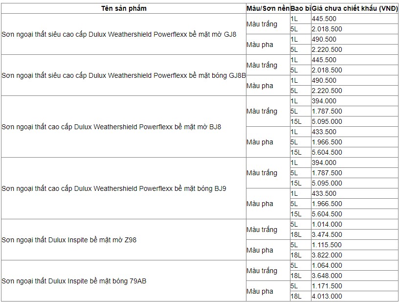6. Bảng báo giá thương hiệu sơn Dulux