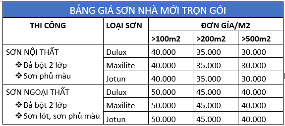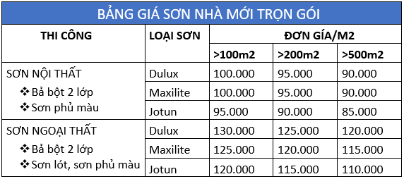 3. Bảng giá sơn nhà trọn gói được tính theo m2: