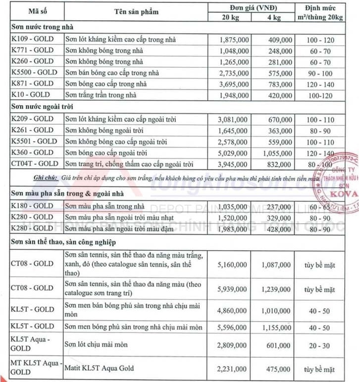 Xem qua bảng báo giá thườn hiệu sơn Kova: