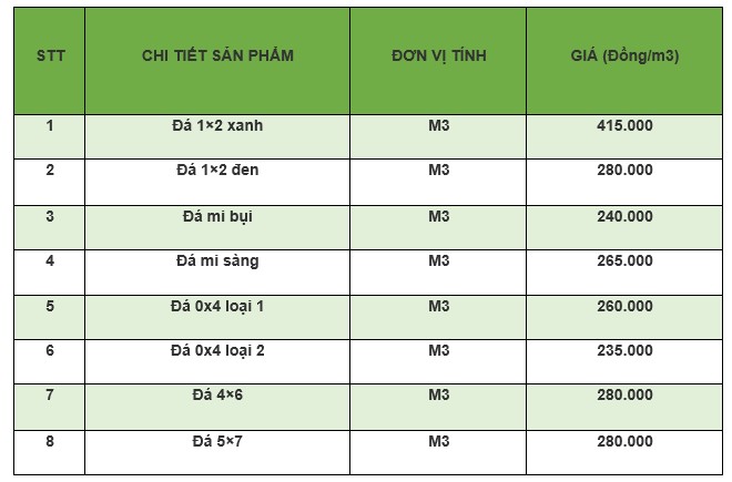 - Đá mi sàng có giá dao động từ 285.000đ đến 295.000đ/m3