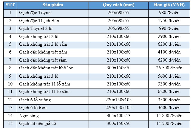 Gạch xây dựng hiện nay cũng rất đa dạng, tùy theo từng hạng mục công trình mà lựa chọn những loại gạch thích hợp. Dưới đây là bảng báo giá vật liệu xây dựng tại Bình Thuận mặt hàng gạch xây dựng: