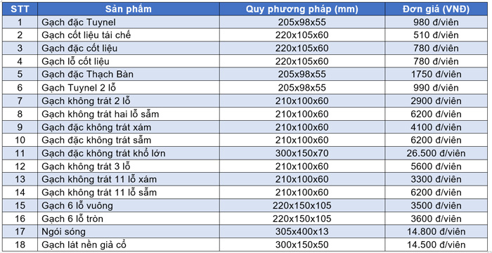 Bảng giá gạch xây dựng tại Hải Dương