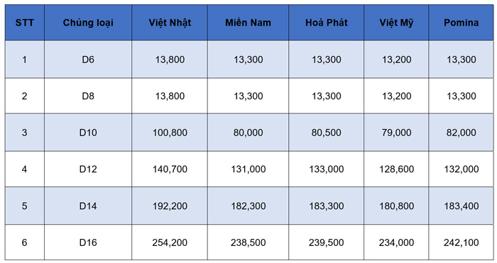 Theo đó, giá thép xây dựng tại Hải Dương đang được bán với các mức khác nhau: thép miền Nam có giá từ 16.000 đồng/kg - 18.000 đồng/kg. Thép Thái Nguyên thì dao động trong mức 16.000 đồng/kg - 17.000 đồng/kg. Thép Pomina có giá từ 13.805 đồng/kg - 14.575 đồng/kg. Còn thép Việt Đức có giá từ 15.961 đồng đồng/kg - 16.181 đồng/kg. Các loại thép khác như théo chữ C có giá từ 14.850 đồng/kg đến 15.510 đồng/kg. Thép chữ I có mức giá dao động từ 15.730 đồng/kg đến 15.890 đồng/kg. Bảng giá cụ thể từng loại thép như bảng dưới đây: