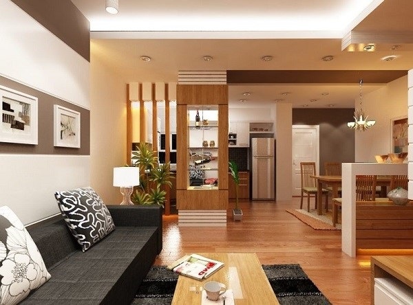 Đây chính là điểm nổi bật của cách thiết kế này không cần bức tường chắn chiếm diện tích nhưng vẫn phân chia rõ ràng. Sự tinh tế trong cách thiết kế ngôi nhà này còn thể hiện ở các bức tranh treo trang trí trên tường tạo không gian lãng mạn trong phòng khách. Với không gian phòng ăn nhà thiết kế thiết kế bàn ăn với 6 chiếc ghế gỗ và hệ thống đèn trang trí trần nhà trông rất xinh xắn và có cảm giác ấm áp khi xum họp cả gia đình. Cách tranhg trí phòng khách này rất khoa học và hiện đại mà được giới trẻ ngày nay sử dụng nhiều.
