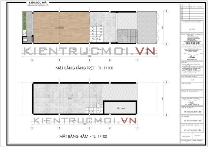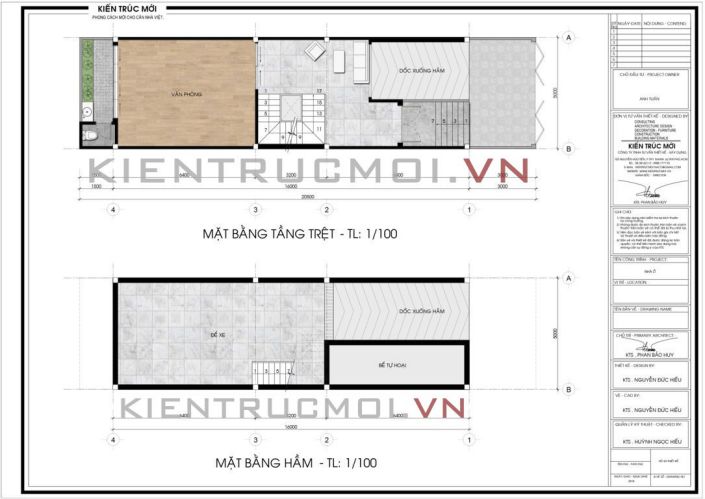 Mặt bằng tầng hầm và mặt bằng tầng trệt : Được xem như phần quan trọng nhất trong phần xây dựng thô, phần móng nhà qua hình vẽ được chia thành 3 gian với : Hầm tự hoại, dốc xuống hầm và nhà để xe thông qua bản vẽ mặt cắt phía dưới với cấu trúc rõ ràng và mạch lạc. Đi lên mặt bằng trên với cầu thang với bên trái là văn phòng và bên phải cầu thang là phòng tiếp khách.