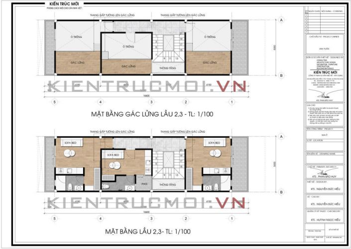 Mặt bằng gác lửng 2-3 : Lần lượt từ trái sang phải là : Phòng ngủ (số 3)- phòng sinh hoạt chung – cầu thang – phòng ngủ (số 4). Không khác quá nhiều so với mặt bằng phía trên. Không gian phù hợp cho các gia đình đông thành viên sinh sống.