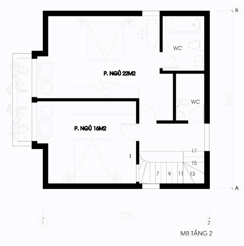 Mặt bằng tầng 2: 2 Phòng ngủ, 2 phòng vệ sinh riêng.