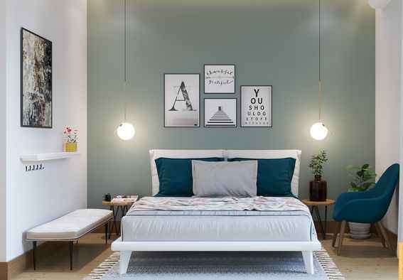 Tường hai bên được sơn trắng, tường chính sơn xanh đậm mang đến thị giác dịu cho toàn bộ không gian. Điểm nhấn nằm ở bức tranh gắn tường đơn giản, không cầu kỳ, một vài tiểu cảnh cây xanh, đèn đầu giường, tấm thảm trải bên dưới. Trong không gian nhỏ như vậy, gia chủ vẫn bố trí tủ để đầu giường, ghế nhỏ và chiếc ghế ngồi chờ, phục vụ tối đa nhất cho khách nghỉ.