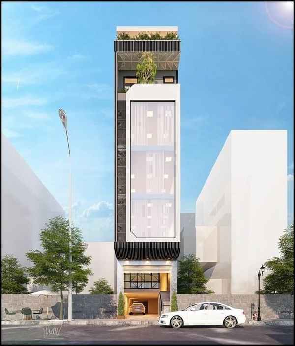 Một mẫu nhà nghỉ 5x20 với mặt tiền kính hiện đại cũng được xem là phương án thiết kế khá độc đáo, hiện đại, phù hợp với nhịp sống năng động hiện nay. Trong kiến trúc này sử dụng tầng hầm bên dưới nhà để khách nghỉ có đủ diện tích rộng thoáng để phương tiện cá nhân của mình. Để tách biệt không gian gara và khu vực lễ tân bên trên, kiến trúc sư sử dụng cầu thang ốp đá trắng đi lên trên. Cổng chính nhà nghỉ 5x20 sử dụng cửa cuốn để đảm bảo an ninh mức tối đa. Tầng tum với tiểu cảnh cây xanh bên trên được xem là giải pháp chống nắng hiệu quả cho cả không gian cũng như mang đến cái nhìn hài hòa.