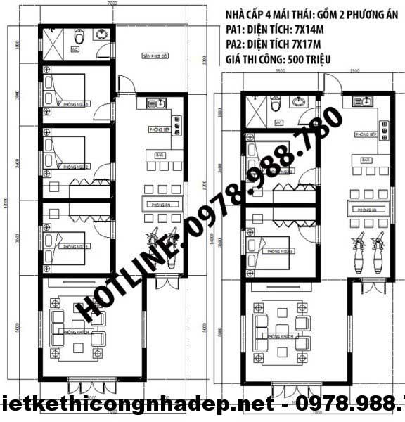 Sẽ có 2 phương án bố trí nội thất mà chúng tôi giới thiệu đến quý khách hàng. Phương án 1 sẽ dành cho nhà cấp 4 có quy mô 7x14m, phương án 2 dành cho nhà có không gian rộng hơn 7x17m. Vì lợi thế diện tích thoáng mát nên phương án 2 được xây dựng thêm 1 phòng ngủ tạo thêm không gian riêng tư cho các thành viên. Phần phía sau nhà thiết kế này sẽ thiết kế giàn mái che bằng kín để gia chủ sử dụng phơi đồ. Phương án 1 sẽ xây dựng sân phơi ở phía sau, sử dụng vật liệu tôn hay kính tùy vào điều kiện của gia đình.