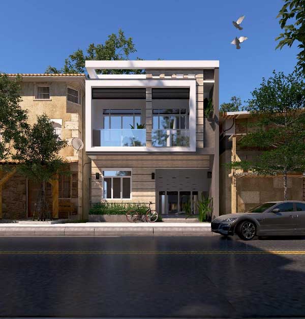 Mẫu thiết kế tiêu biểu cho mẫu nhà ống 2 tầng 7x12m, phổ biến trong kiến trúc nhà ở dân sinh hiện nay được thiết kế với kiến trúc chữ L, theo đuổi phong cách tân cổ điển, sang trọng, hiện đại, tối giản. Ngôi nhà với 2 ban công rộng hướng ra mặt tiền. Ban công thứ nhất được kết hợp với phần mái vòm tiêu biểu biểu cho kiến trúc tân cổ điển, ban công thứ hai với diện tích nhỏ gọn hơn, ôm trọng diện tích cửa chính cùng với giàn hoa rủ đầy sự cách điệu. Lan can được sử dụng với vật liệu thép sơn đen, đơn giản bắt mắt, phù hợp với phong cách tân cổ điển. Phần sân trước của ngôi nhà được thiết kế để gia chủ hoàn toàn có thể để oto ngay trong không gian nhà của mình. Bao bên ngoài là hệ thống tường rào bằng sắt, sơn đen phù hợp với tổng thể kiến trúc của căn nhà.