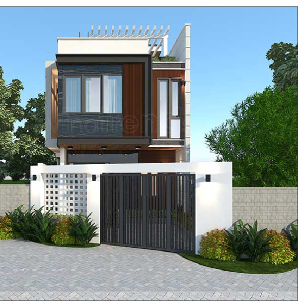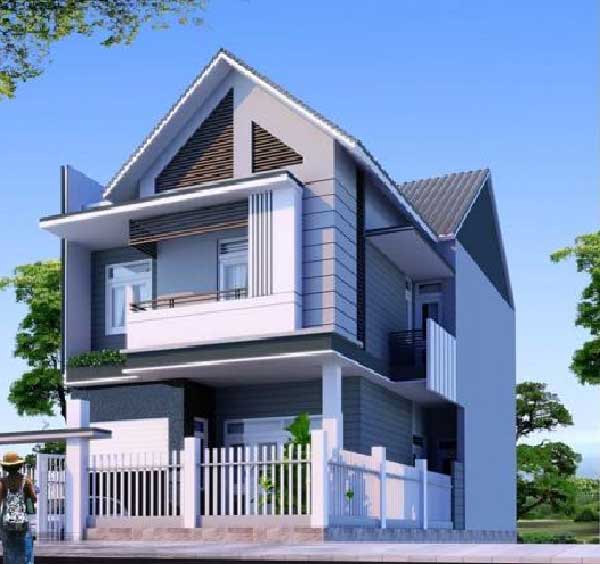 Phong cách hiện đại vẫn sẽ tiếp tục được sử dụng cho thiết kế nhà ống 2 tầng 7x12m nhưng kết hợp với mái Thái ấn tượng. Mặt tiền ngôi nhà sử dụng kiến trúc khối hộp tối đa hết được diện tích sử dụng. Ban công của ngôi nhà này có diện tích rất nhỏ, kết hợp tường bê tông cách điệu che nắng cho không gian tầng hai. Không gian xanh sử dụng cho căn nhà được bố trí ở cửa sổ với khu vưc nho nhỏ sân trước. Mái được làm cao hơn so với thông thường để chống nóng hiệu quả, với mặt tiền kết hợp lam để lưu thông không khi vào trong nhà.