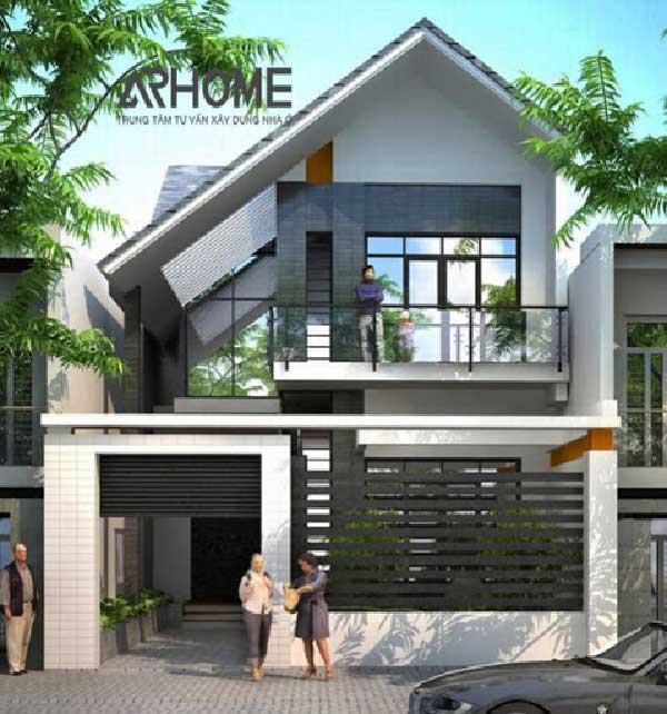 Mẫu nhà ống 2 tầng 7x12m hiện đại với phần mái Thái lệch tạo nên ấn tượng kiến trúc sáng tạo. Tất cả những điểm chú ý đều đổ dồn lên khu vực mái của ngôi nhà này với một bên dài hơn hơn, bao phủ toàn bộ mặt tiền của ngôi nhà. Kiến trúc này giúp cho ngôi nhà vừa vặn với diện tích mà không làm ảnh hưởng đến không gian xung quanh.