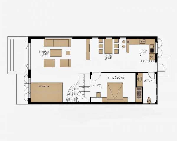 Với không gian tầng 1 bao gồm: 1 phòng khách, 1 phòng bếp + ăn, 1 phòng ngủ và 1 nhà vệ sinh.