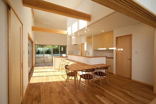 Bên trong nội thất là một khung cảnh không quá nhiều màu sắc nhưng thể hiện sự giá trị khi chủ nhà đã mang phong cách thiết kế nội thất từ Nhật Bản vào văn hóa và lối sống của người Việt để làm nên một không gian mơ ước của rất nhiều người. Qua góc chụp bạn có thể thấy nét tao nhã sử dụng nhịp nhàng gam màu trắng làm chủ đạo khi phần còn lại là màu sắc từ gỗ tự nhiên. Tối giản trong hình thái trang trí trong cả bố cục để bám sát vào kiến trúc mà họ theo đuổi.